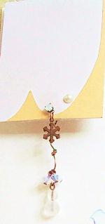 ピアスの頭には、冬にピッタリな半透明の白いガラスがついています。小さい茶色の4本爪でとまっていてかわいいですよ。そして耳たぶの後ろでは、くもりガラス風の天然石水晶で出来た白い雪ダルマが、くねくねのチェーンでくるくる揺れています(笑)