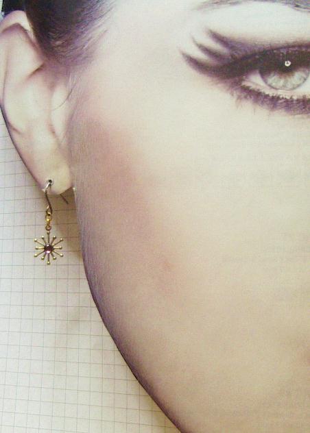華奢な雪の結晶モチーフが揺れるデザインです。小さな粉雪がキラキラ光っているのを表しているのかも知れません。真ん中には天然石ガーネットがついています。赤ワインのように濃い赤色です。黒っぽく見えますが、光が当たると艶やかに赤く光ります。ガーネットはアンティークなデザインにとてもよく合ってます。素敵ですよ。