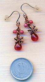 | 石やガラスなどの素材 | 赤ワイン色の涙のしずくはガラス製です。2個の丸い石は天然石ロードナイトです。大きさ4ミリです。 |
