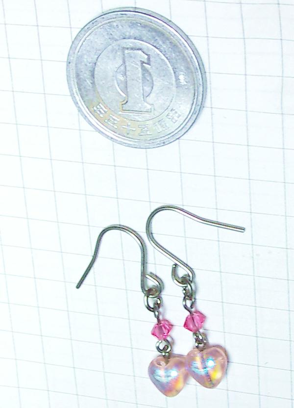 シンプルですが昔からの当店の人気デザインです。春にピッタリな桜色のハートピアスです。派手すぎず華奢なデザインですのでつけやすいですよ。 淡いピんク色のガラスハートはうっすら虹色に輝きます。 その上の小さいガラスはクリスタル・ガラスで色はハートとお揃いのうすピンクです。こちらは透きとおるようにキラリと光ります。光り方の異なる2つのガラスがあわさって、ちいさいのに良く光ってとってもかわいいですよ。
