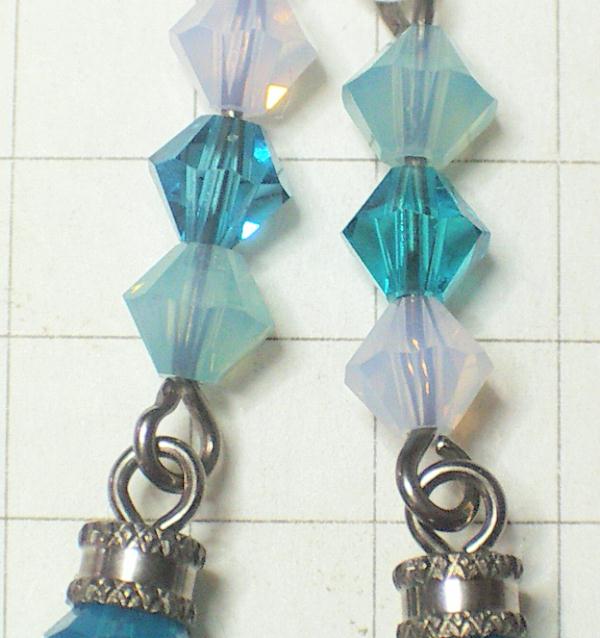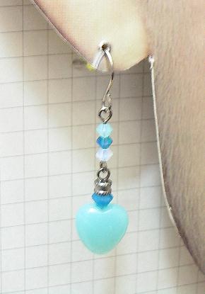 不透明みずいろのアマゾナイトハートが揺れるデザイン。ハートの上にはアマゾナイトとお揃いの小さくかわいいクリスタルガラスが縦に並んで揺れます。かわいいですよ。
