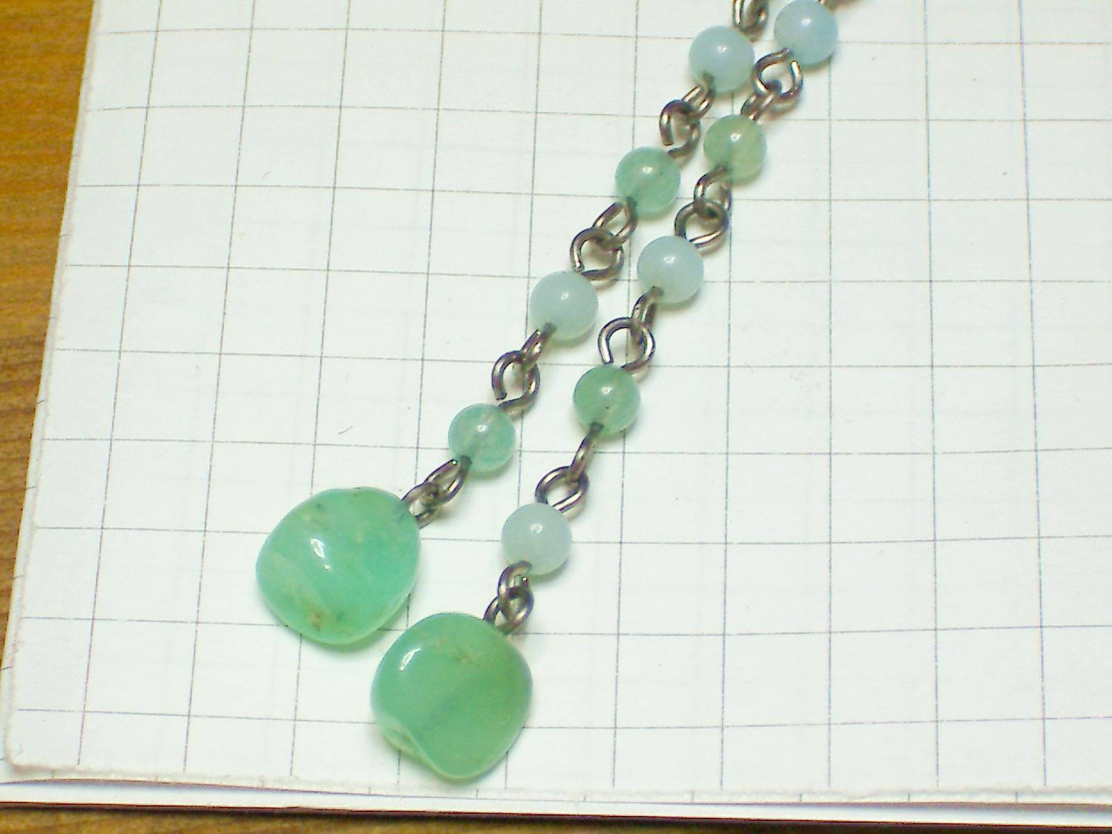 石ころみたいにコロンとした天然石クリソプレースが天然石チェーンで揺れるデザインです。シンプルですが作りがしっかりしてて天然石の素材を活かしたデザインとなっています。チェーン部分はグリーン&うすブルー系の天然石です☆海につけていきたくなるデザインですね♪