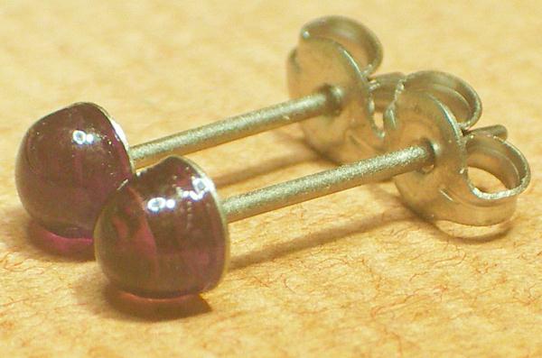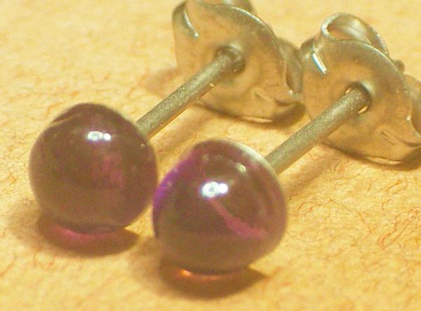 石は天然石アメジストです。大きさは4ミリでございます。半円タイプ(玉を半分に切った形)です。石の色は濃淡のあるむらさきでございます。