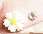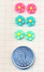 お花の部分は樹脂製です。白いお花です。大きさは8ミリくらいです。お花の厚さは2ミリ前後です。 新色のピンク、ブルーグリーン、ミントグリーンが入荷しました。