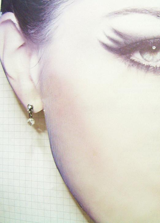 拡大しました。ピアス軸や後ろのピアスキャッチ、石を留める丸枠、丸枠の下についているわっか、わっかの下で揺れる部分の金属など金属すべて純チタン製(ピュアチタン)です。チタン以外の金属(メッキや溶接用のロウやハンダなど)は一切使っておりません。 |